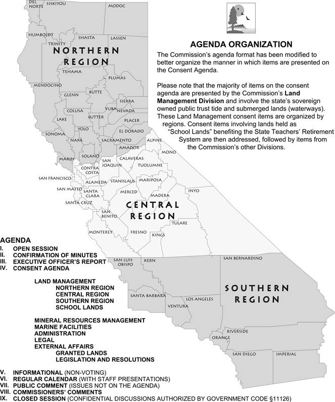 Please note that the items are posted as soon as available on the Commission’s website at www.slc.ca.gov. The items and exhibits may be reviewed and downloaded individually or collectively. Past meetings, including items, transcripts, and, more recently, webcasts, may also be viewed there.