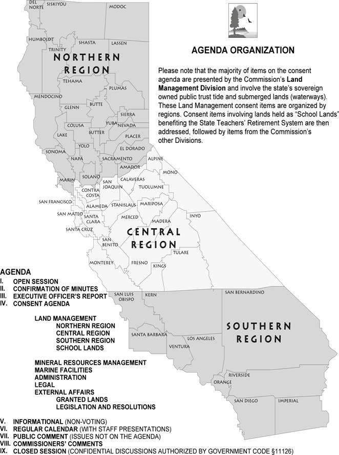 Please note that the items are posted as soon as available on the Commission’s website at www.slc.ca.gov. The items and exhibits may be reviewed and downloaded individually or collectively. Past meetings, including items, transcripts, and webcasts, may also be viewed there.