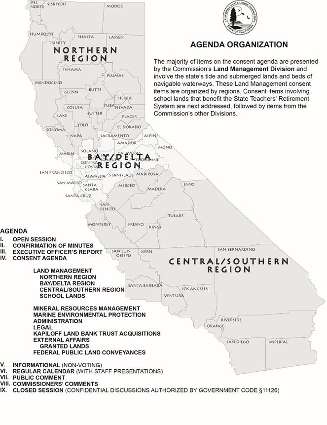 CALIFORNIA STATE LANDS COMMISSION (PARTY): Consider approval of the proposed repeal of California Code of Regulations, Title 2, Division 3, Chapter 1, Articles 7 and 8. CEQA Consideration: not a project. (A & S: Statewide) (Staff: P. Huber, J. Frey) |
